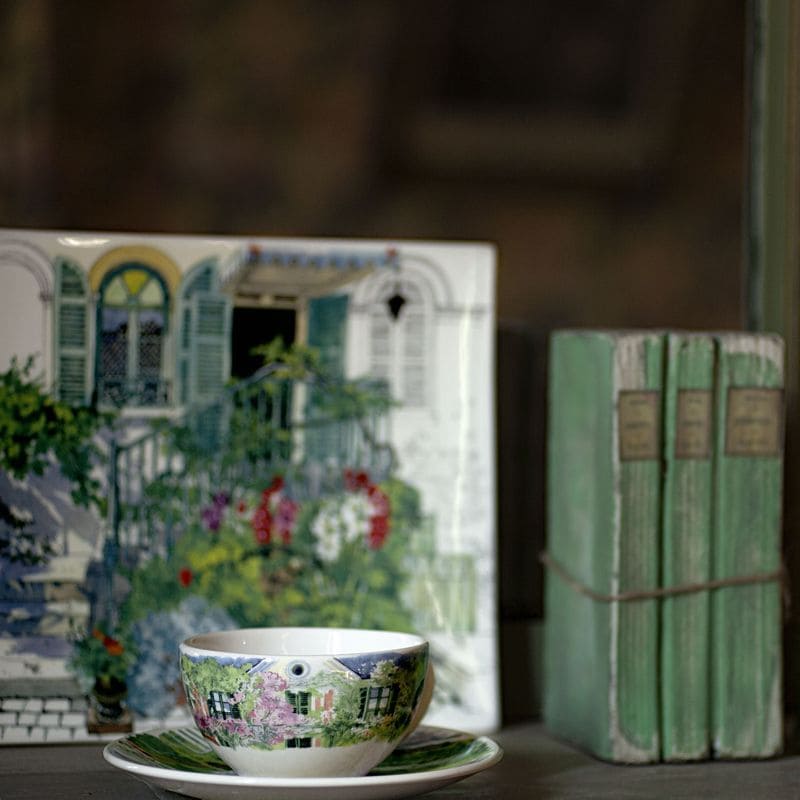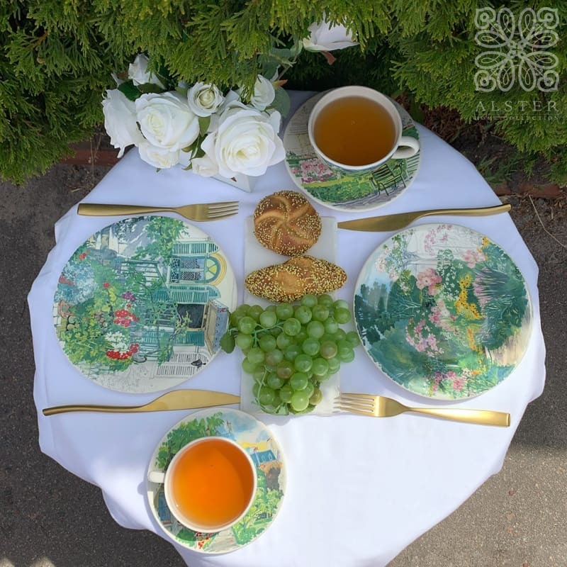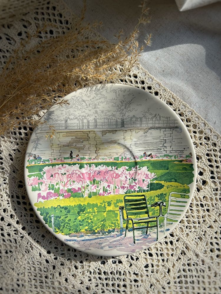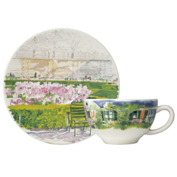 Фабрис Муаро приглашает нас прогуляться по архитектурным окрестностям, украшенным цветами, расцветающими в красках лета – де Пари в Живерни, с помощью столового сервиза, вдохновленного 8 акварелями, взятыми из работ «Сад Клода Моне Живерни», изданный издательством Gallimard, и «Сады Парижа», изданные издательством Editions du Pacifique. Каждое произведение изображает цветочный сад, наполненный историей и поэзией. Каждая коробка с тарелками для десертов и закусок состоит из четырех разных тарелок, представляющих два сада в Париже и два сада в Живерни.