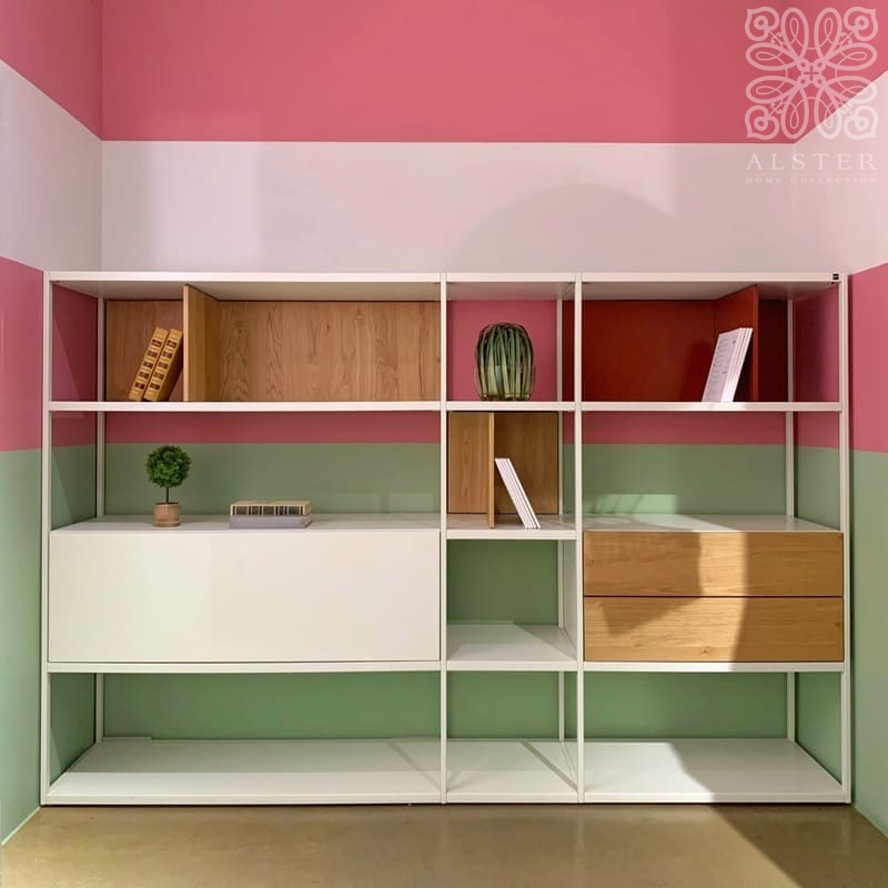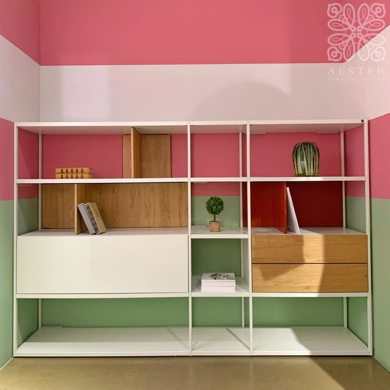 Now by Hulsta Стеллаж для книг и документов, размеры: ширина - 217,5 см, глубина - 42 см, высота - 145 см. В комплектацию входят: 2 выдвижных ящика и 1 с откидной дверцей с системой открывания push-to-open (нажать, чтобы открыть), 3 задние стенки-разделители. Материал: металлический каркас, МДФ, покрытый белым матовым/глянцевым лаком, ДСП, покрытый шпоном дуба. Цвет - белый с коричневыми вставками. Производитель: Германия.