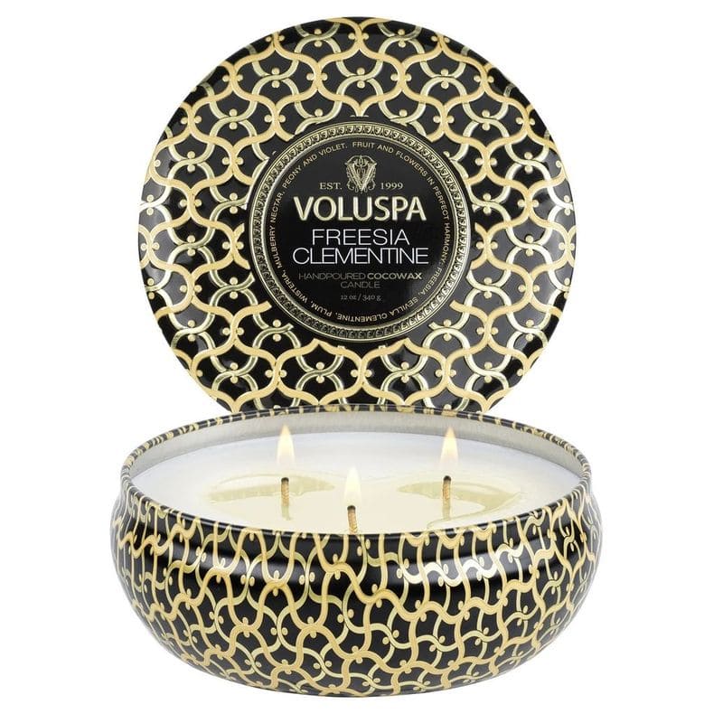 Ароматическая свеча Voluspa Freesia Clementine помещена в жестяной подсвечник, расписанный знаковым узором коллекции Maison. После того, как свеча закончится, банку можно использовать для хранения украшений или в качестве декора.