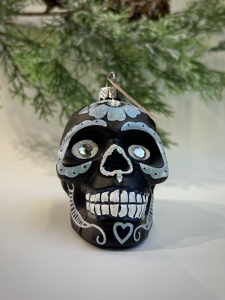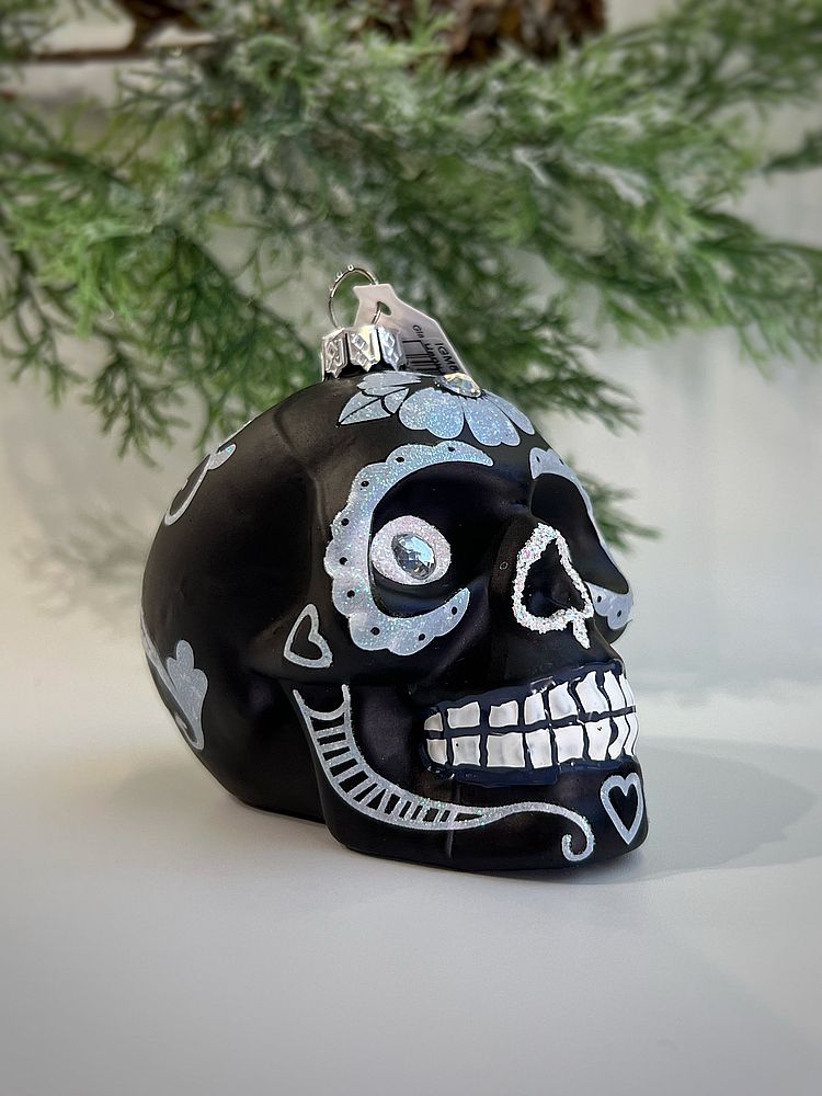 Inges Christmas Decor Magic Skull Стеклянная елочная игрушка Черный череп с голубым цветком и кристаллом, высота - 9 см (вместе с креплением!!!). Дополнительную информацию смотрите во вкладке "Описание".
