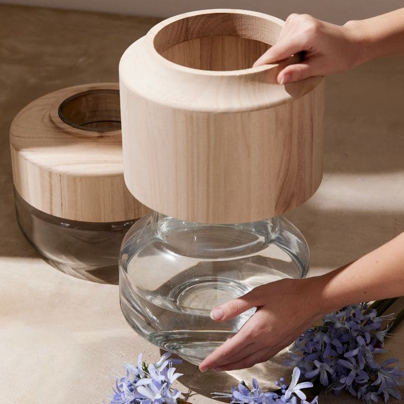 EDG Декоративная ваза Biforma Cilindro, размеры: 23х23х30h см, материал - стекло и массив дерева, цвет - прозрачный, натуральный. Ваза подходит для использования с водой!!!!!