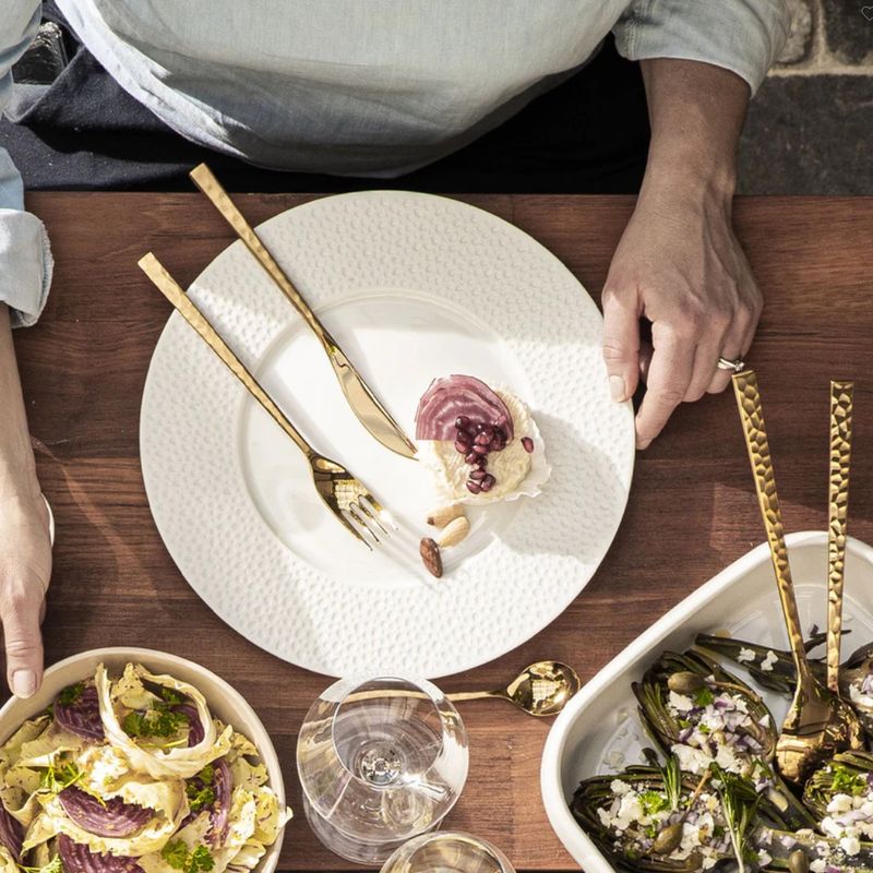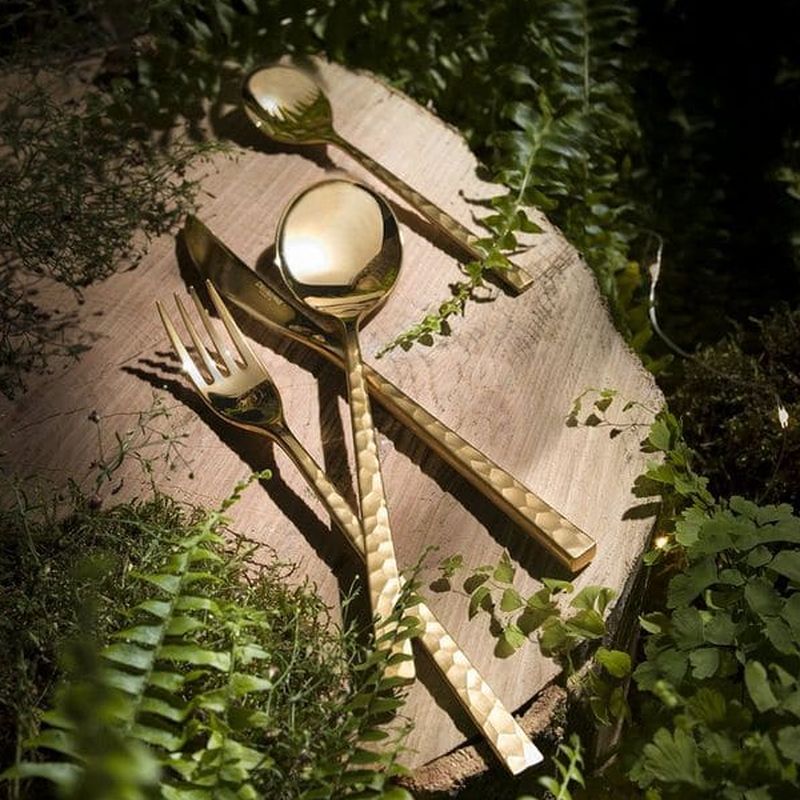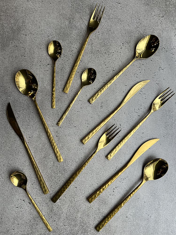 Смелость, элегантность и трендовость: отделка столовых приборов Fuse Martele Laiton оправдывает все свои обещания благодаря мягкому золотистому оттенку. Матовая и текстурированная отделка - одновременно примитивная и утонченная. Дизайн каждой кованой ручки передает аутентичность и придает столу характер, обеспечивая при этом удобство повседневного использования.
