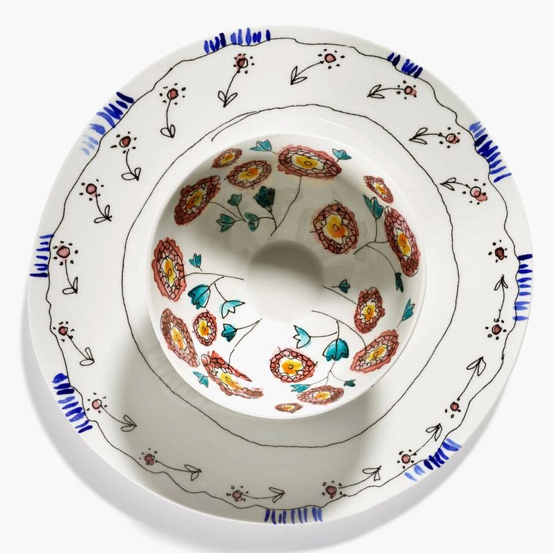 Serax и Marni создали элегантный набор фарфоровой посуды из 120 предметов, который отражает художественное видение итальянского дома моды. Креативный директор Marni Франческо Риссо разработал цветочный мотив, вдохновленный природой. С помощью деколи на тонкий костяной фарфор наносится рисунок, после чего он покрывается глазурью, что делает его более износостойким. Слегка асимметричные формы тарелок, мисок, чашек, блюдец и чайников только подчеркивают качество фарфора, изготовленного вручную.