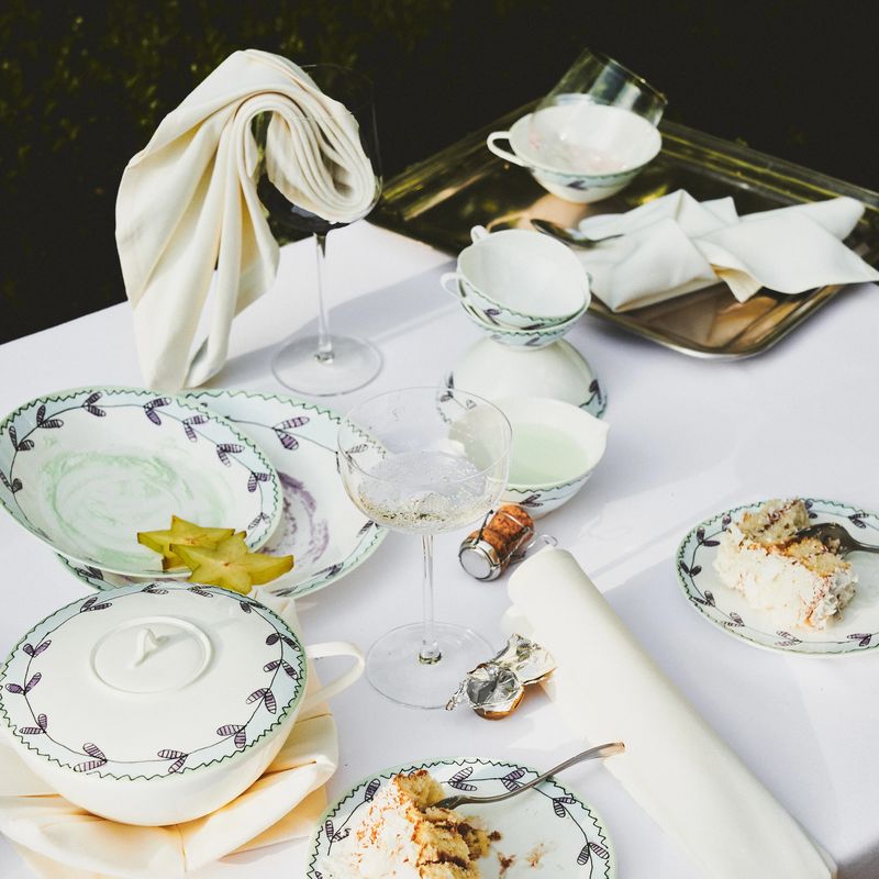 Serax и Marni создали элегантный набор фарфоровой посуды из 120 предметов, который отражает художественное видение итальянского дома моды. Креативный директор Marni Франческо Риссо разработал цветочный мотив, вдохновленный природой. С помощью деколи на тонкий костяной фарфор наносится рисунок, после чего он покрывается глазурью, что делает его более износостойким. Слегка асимметричные формы тарелок, мисок, чашек, блюдец и чайников только подчеркивают качество фарфора, изготовленного вручную.