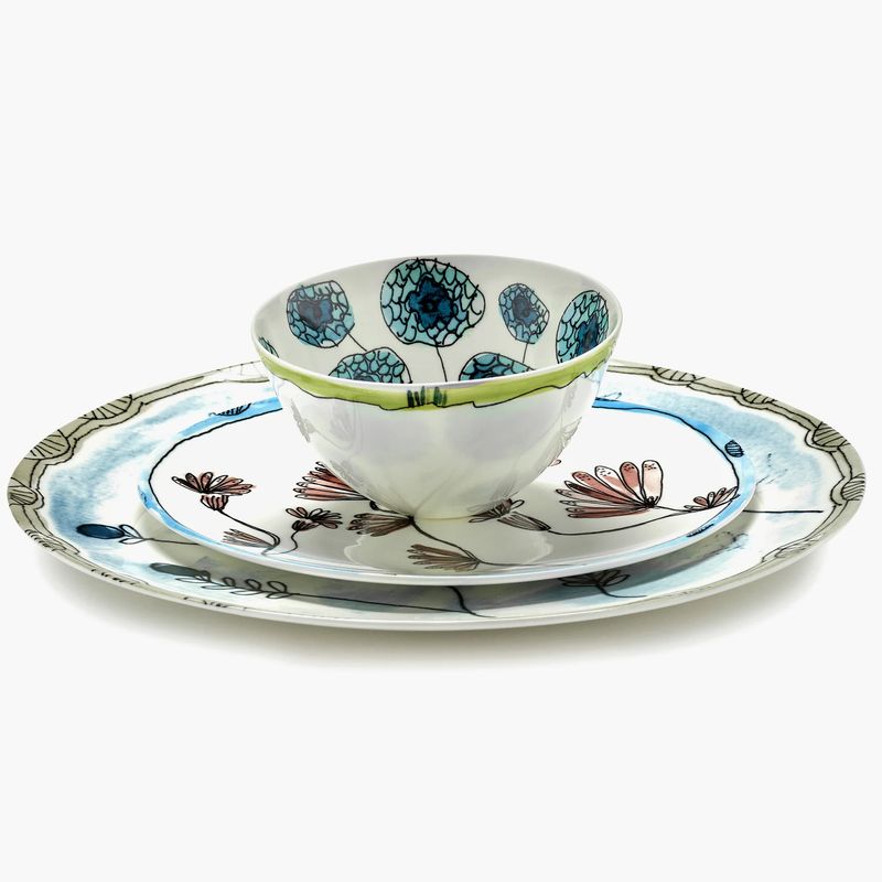 Каждая тарелка "Камелия" украшена акварельными иллюстрациями темно-фиолетовых полуночных цветов баклажана в верхней части, а светло-голубые игривые и натуральные ободки придают блюду неожиданный вид. Эти тарелки яркие и жизнерадостные.