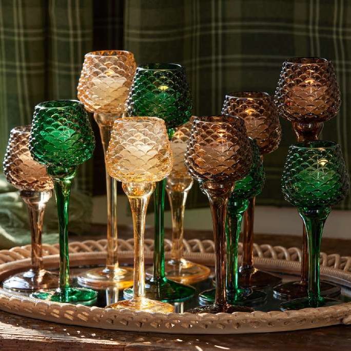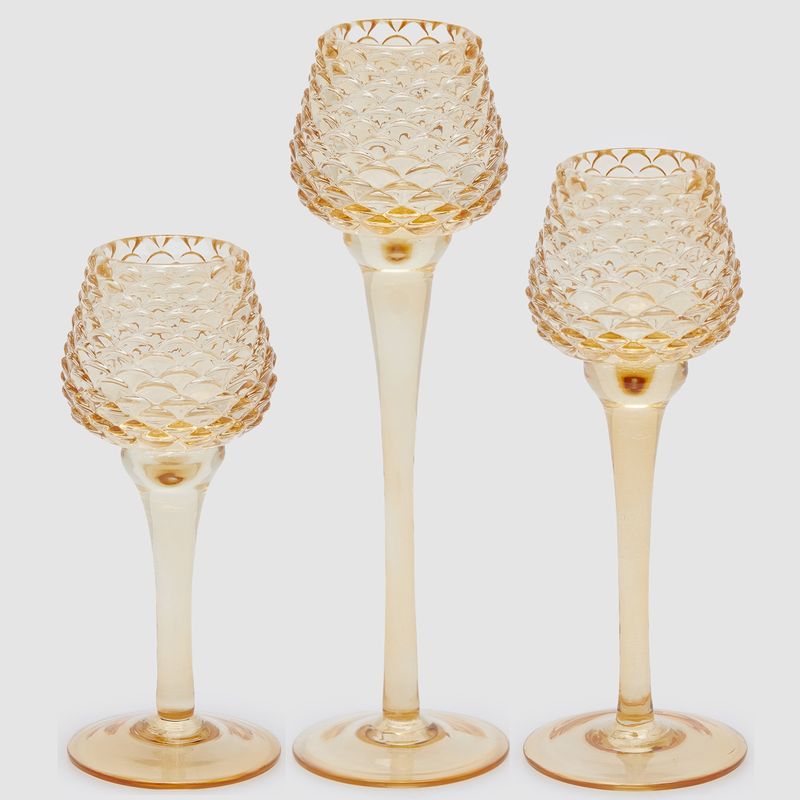 EDG Набор из 3-х стеклянных подсвечников - бокалов, чаша напоминает форму шишки, размеры: диаметр - 7,5 см, высоты: 26 см, 21,5 см и 18,5 см, цвет - янтарный прозрачный