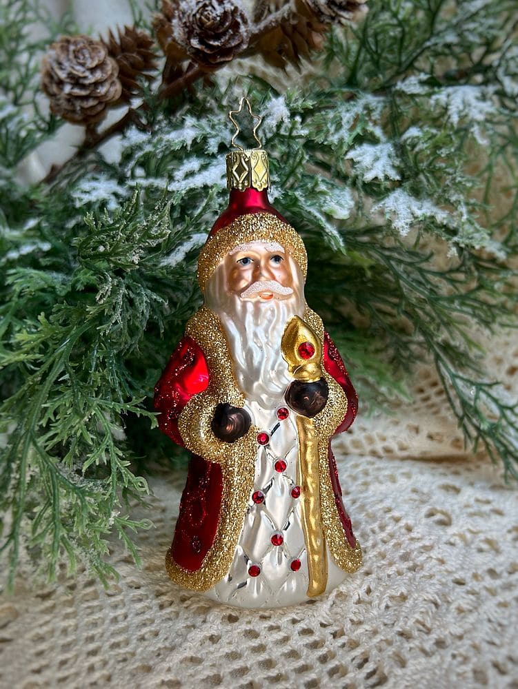Inges Christmas Decor Festive Father Christmas Стеклянная елочная игрушка ручной работы Дед Мороз с посохом и кристаллами, размер - 12 см. Чтобы елочные игрушки Inge Glas служили вам в течение долгих лет, пожалуйста, соблюдайте правила по уходу (смотрите вкладку Подробности)