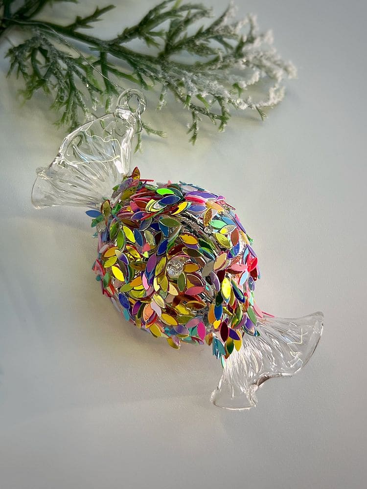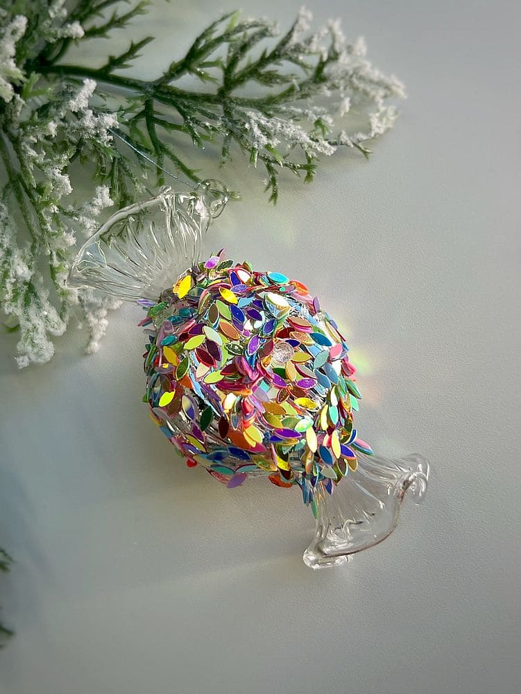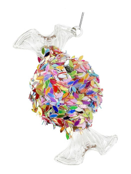 ShiShi Стеклянная елочная игрушка Конфета - круглая карамель с крупными блестками, высота - 8  см, цвет - прозрачный, разноцветный