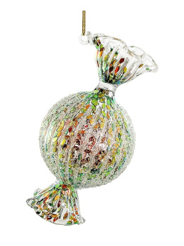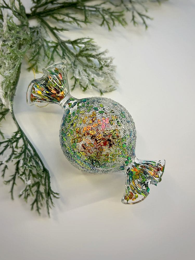 ShiShi Стеклянная елочная игрушка Конфета - круглая карамель с крупными желто-зелеными блестками, высота - 10 см, цвет - прозрачный, зеленый