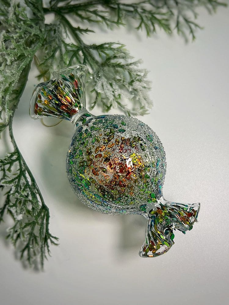 ShiShi Стеклянная елочная игрушка Круглая карамель с желто-зелеными блестками, высота - 10 см