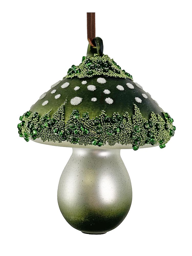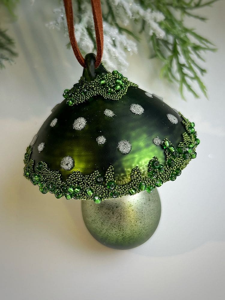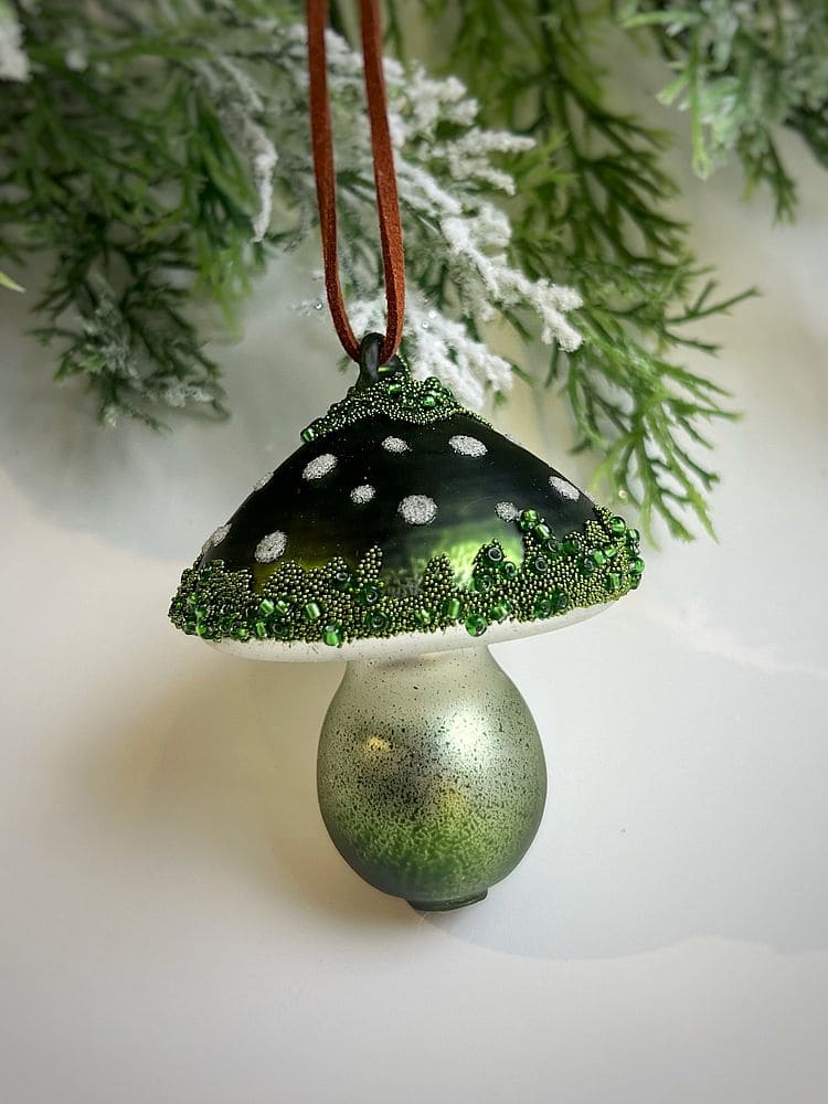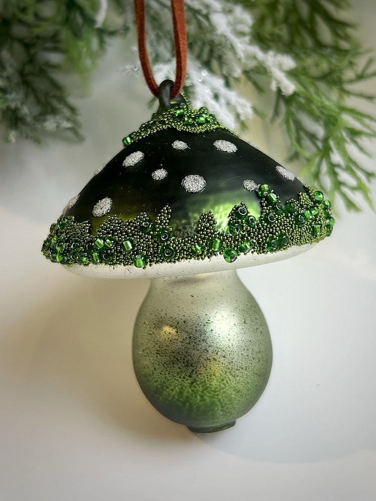 ShiShi Стеклянная елочная игрушка Гриб Мухомор с бисером и блестками, высота - 8 см, цвет - зеленый